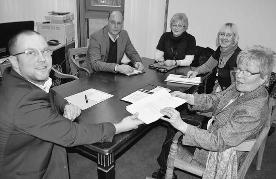 Im Gespräch: SPD-Fraktionsvorsitzender Olaf Winkelmann (2. v. l.) , Landtagsabgeordnete Inge Howe, Gudrun Kreh und Gertrud Wege übergeben Bali-Therme-Geschäftsführer Gerd Gerhards (l.) die gesammelten Unterschriften und hoffen auf einen Kompromiss. FOTO: L. DRÖGEMEIER