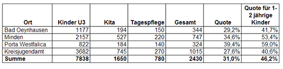 Kreis Minden-Lübbecke: Für die 7.838 Kinder unter 3 Jahren stehen im Mühlenkreis 2.430 Betreuungsplätze zur Verfügung. Das ist das Stand nach Ende der Meldefrist am vergangenen Freitag, der heute in Düsseldorf von Ministerin Ute Schäfer bekanntgegeben wurde. Daraus ergibt sich eine Quote von 46,2% für die Kinder, die ab August einen Rechtsanspruch auf einen Betreuungsplatz haben.