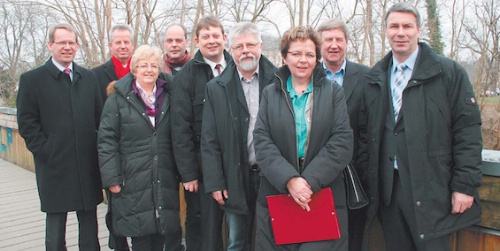 Bad Oeynhausens Bürgermeister Klaus Mueller-Zahlmann, sein Löhner Amtskollege Heinz-Dieter Held, Inge Howe MdL, Dr. Olaf Winkelmann, Stefan Schwartze MdB, Wolfgang Böhm, die Angela Lück MdL, Lothar Ibrügger sowie Christian Dahm Mdl. Fotos: Viola Dietrich