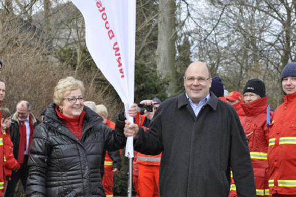 Inge Howe (MdL) und Steffen Kampeter (MdB) schickten das DLRG-Rettungsholzboot "Tausendfüßler" und 22 Beibote auf die Strecke in Richtung Düsseldorf. Das Boot stamd aus dem Jahre 1962 und wird auf seine Fahrt alle Flüsse und Kanäle abfahren.