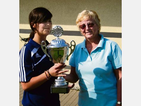 Eileen Köhler von der Gruppe 2 der Jugendfeuerwehr Haldem-Arrenkamp erhält aus den Händen der Landtagsabgeordneten Inge Howe den Wanderpokal für den 2. Platz.