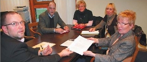 Gerd Gerhard, Geschäftsführer der Bali-Therme (links), nimmt die Unterschriftenliste entgegen. Mit (von links) dem SPD-Fraktionsvorsitzenden Dr. Olaf Winkelmann, der SPD-Landtagsabgeordneten Inge Howe sowie den ehemaligen Patienten Gudrun Kreh und Gertrud Wege setzte er sich an einen Tisch.