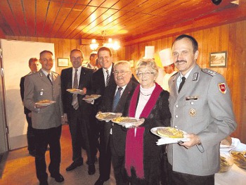 Ließen sich die Stippgrütze schmecken: Oberstleutnant Frank Söhnholz, Landrat Dr. Ralf Niermann, die Landtagsabgeordneten Kai Abruszat und Inge Howe (2. v. r.), Vize-Bürgermeister Egon Stellbrink und Oberst Wolfgang Pirner (v. l.).