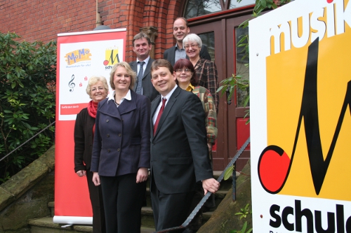 Werben gemeinsam für MoMo als Rundumpacket in den Grundschulen: Die SPD-Politiker Inge Howe, MdL (links) und Stefan Schwartze, MdB (rechts) gemeinsam mit Ursula Sieker, Vorsitzende des Kulturausschusses und Olaf Winkelmann, SPD-Fraktionsvorsitzender. Vorgestellt haben das Projekt Beate von Rüdiger, Leiterin der Städtischen Musikschule (1. Reihe, Bildmitte), ihre Vertreterin Beatrix Recktenwald (2. Reihe, rechts) und Erster Beigeordneter Peter Brand (3. Reihe, links).