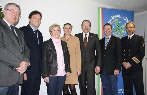 Viel Fläche hat aber auch die „Polizei zu Lande“ im Kreis Minden-Lübbecke zu betreuen. In sechs Polizeiwachen sorgen gut 165 Polizeibeamte für die Sicherheit der Bürger im Mühlenkreis. Insgesamt verfügt die Kreispolizeibehörde Minden-Lübbecke über ca. 480 Beschäftigte im Polizeivollzugsdienst, der Kriminalpolizei und in der Verwaltung. „Die Mitarbeiter wehren Gefahren für die öffentliche Sicherheit ab, bekämpfen Kriminalität sowie Unfälle und bewältigen Einsätze“ erklärte Landrat Dr. Ralf Niermann als oberster Leiter der Kreispolizeibehörde.