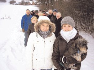 „Wir haben genug Spürhunde dabei“, kontert Breuker, der Schriftführer des Kulturausschusses, in dem die örtlichen Vereine organisiert sind. Ausgerechnet am Tag seiner Einweihung liegt der neue Lohfelder Radweg, der an der Eisberger Straße eine Lücke schließt, unter einer dichten Schneedecke. Wo die 920 Meter lange Route verläuft, lässt sich nur erahnen. Dennoch machen sich rund 50 Einwohner freudig auf den Weg, bei der Witterung natürlich zu Fuß.