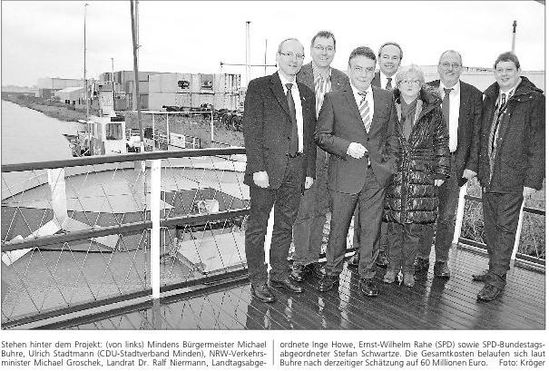 Der Förderbescheid ist nach Angaben der Stadt Minden wie bereits berichtet Mitte Dezember eingetroffen. So war beim gestrigen Informationsbesuch von Michael Groschek, NRW-Minister für Bauen, Wohnen, Stadtentwicklung und Verkehr von einer stabilen Finanzierung die Rede. In großer Runde - anwesend waren unter anderem die beiden Landtagsabgeordneten Inge Howe und Ernst-Wilhelm Rahe, Landrat Dr. Ralf Niermann, der Geschäftsführer der Regio Port Minden Joachim Schmidt sowie Vertreter der Mindener Politik und Verwaltung - traf sich der Minister auf dem Raddampfer »Wappen von Minden«.