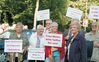 Demonstration: Mit Plakaten machten Anita Wiese (v. l.), Margret Nolting, Johan Tholen, Rotraud Dreyszas, Erwin Knollmann und Rudolf Hansmeier die Ausschussvorsitzende Inge Howe (r.) auf ihr Anliegen aufmerksam. Rund 50 weitere Mitglieder der Rheumaliga waren vor Ort. FOTO: HEIDI FROREICH