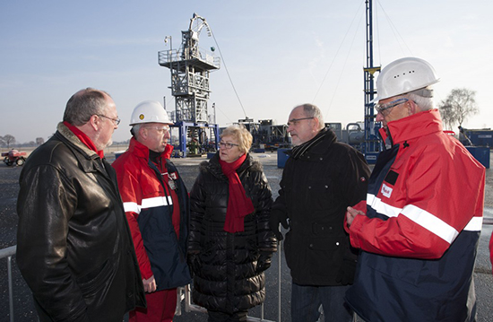 Bild: Ernst-Wilhelm Rahe, Inge Howe, Regierungspräsident Dr. Gerd Bollermann mit Vertretern von ExxonMobil am Bohrloch (Foto: Bezreg. Arnsberg)